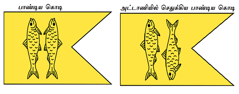 “இங்கே பாருங்க.. பாண்டிய கொடியை செதுக்கி இருக்காங்க.. ஆனா, இதில் வித்யாசம் இருக்குது.. கொடியில் இரண்டு மீன்களின் தலை பகுதி மேலே தானே இருக்கும்.. இங்கே ஒரு மீனோட தலை கீழேயும் வால் மேலேயும் இருக்குது.” என்றாள்.